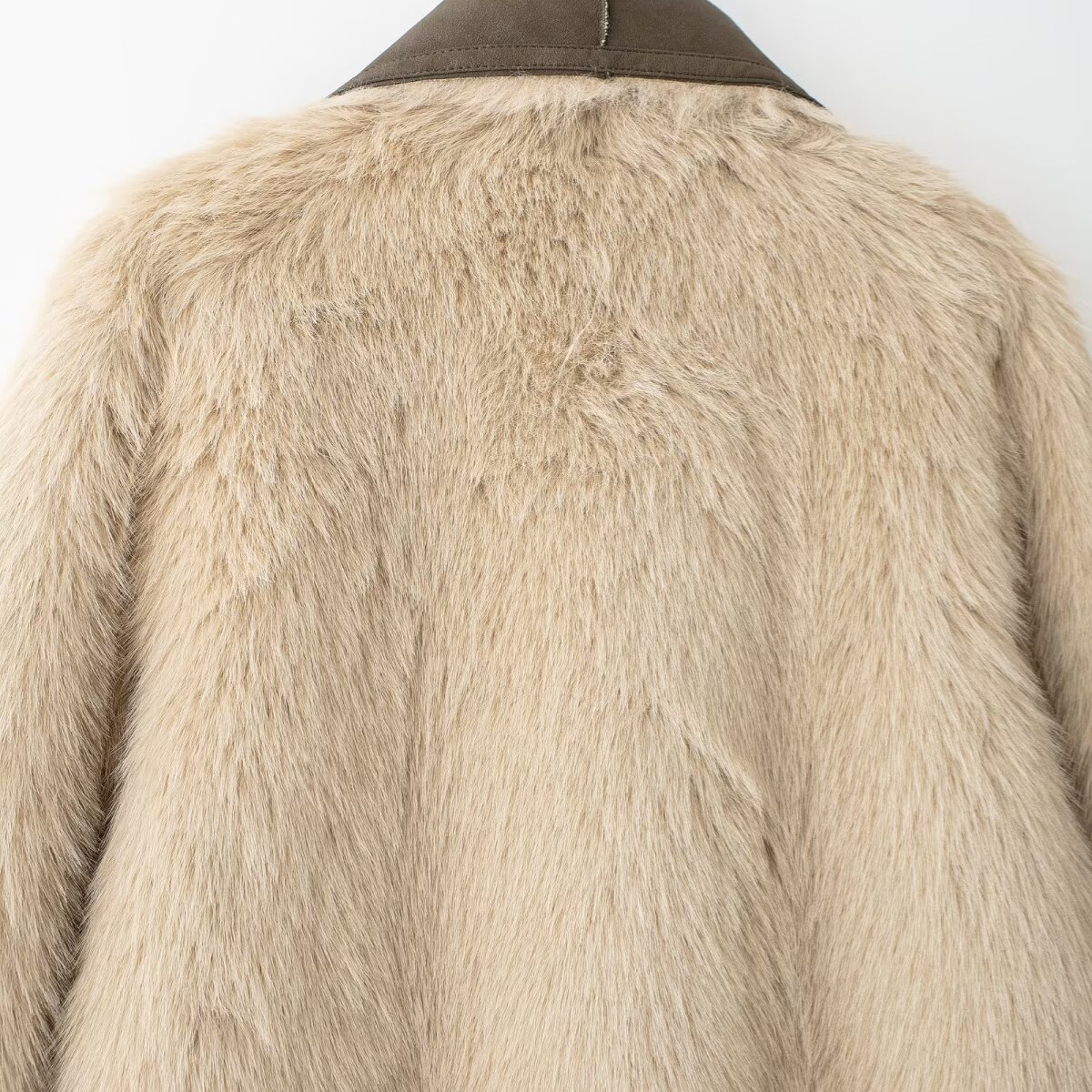 - Mặt 2 (Mặt Da Lộn): Khi lộn ngược lại, áo biến thành chiếc măng tô da lộn màu nâu tây thời thượng. Phần lông trở thành viền cổ và tay áo điểm xuyết, tạo nét Vintage cổ điển rất lạ mắt.