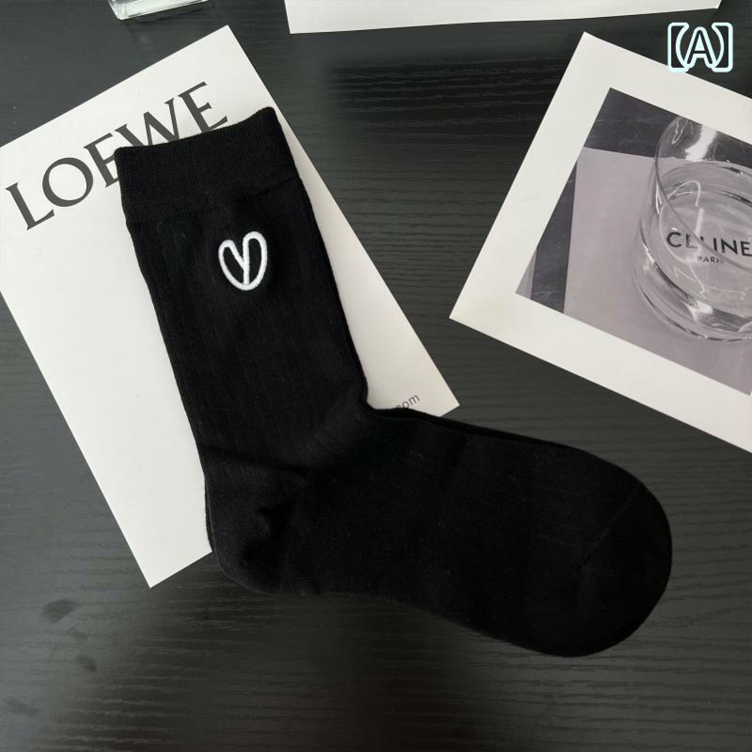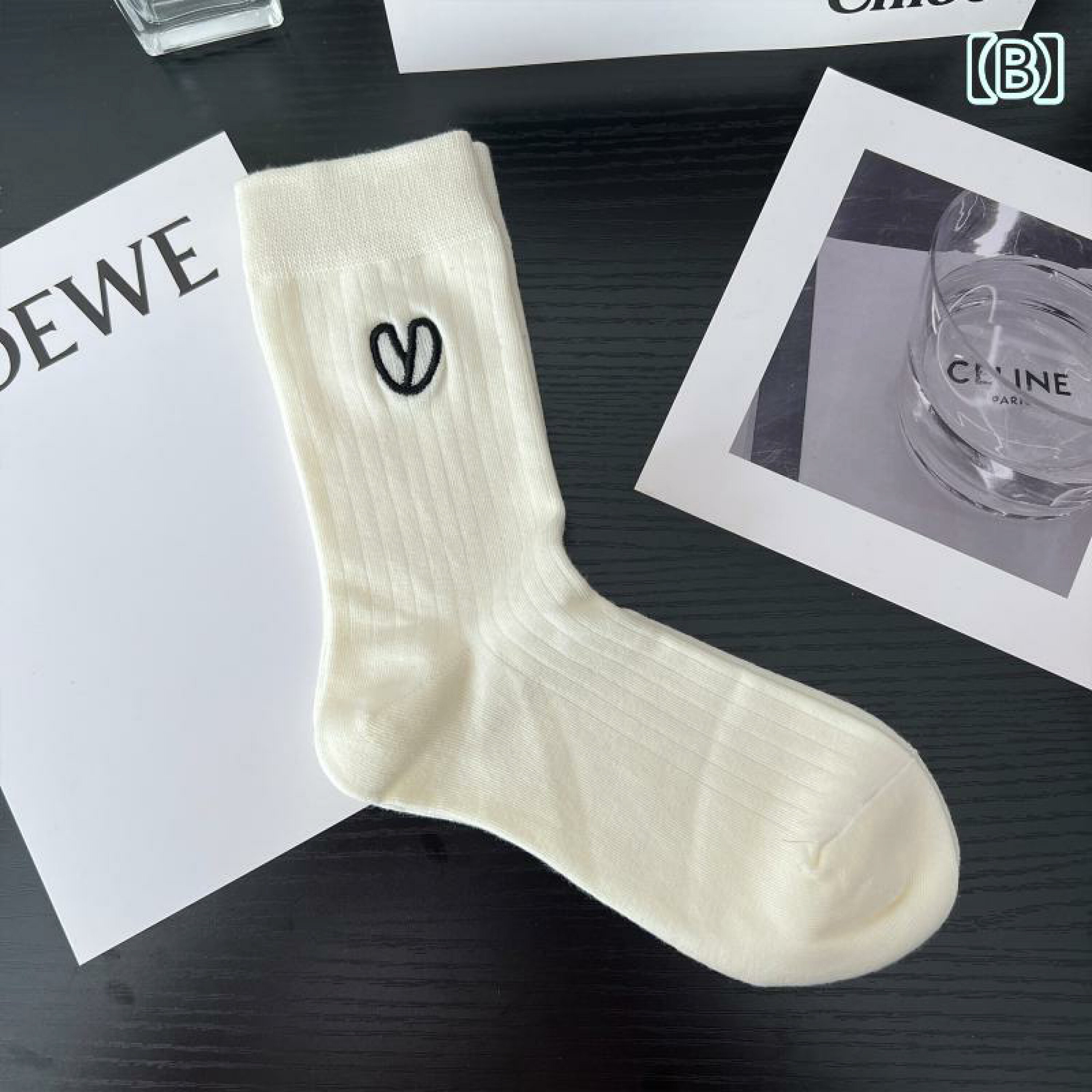 Thiết kế Minimalist: Dáng tất cổ cao vừa phải (mid-calf), ôm chân gọn gàng. Điểm nhấn là họa tiết trái tim thêu nổi (outline) nhỏ xinh ở cổ tất, nhìn vừa đơn giản vừa tinh tế.