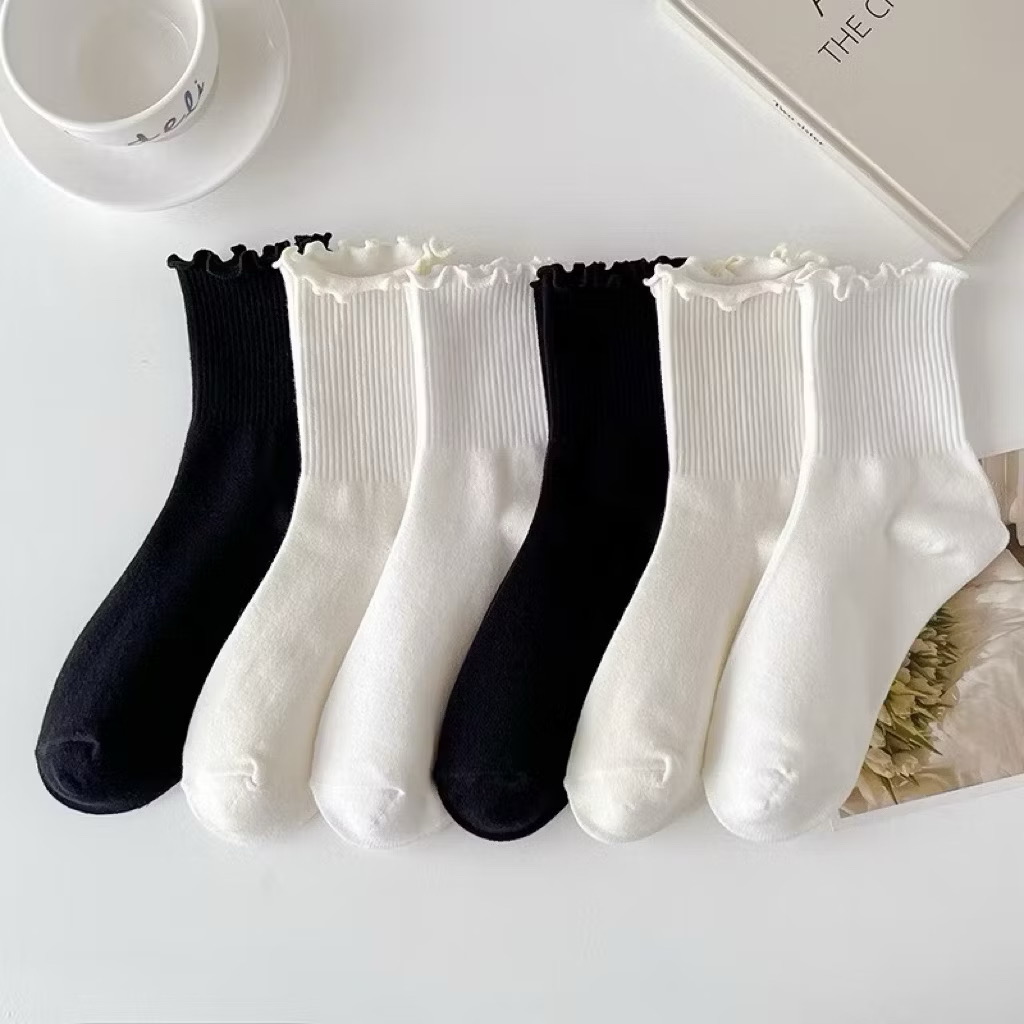 Thiết kế Viền Bèo (Ruffle): Phần cổ tất được dệt bo chun tạo hiệu ứng lượn sóng (bèo nhún) tự nhiên, vừa điệu đà vừa giúp tất không bị hằn lên da chân.